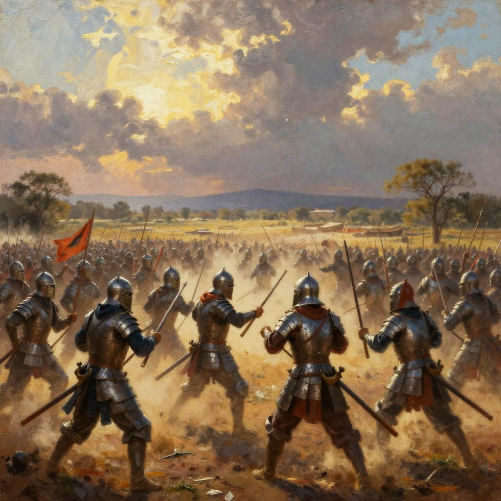 Panipat battlefield vista at sunrise, ancient warriors clashing in detailed armor, dust rising amidst chaotic battle, historically accurate Mughal and Maratha soldiers, dramatic skies and cinematic lighting, epic war scene, oil painting style