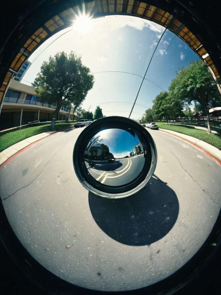 Wide-angle fisheye reflection of an urban street scene captured in a round convex mirror. A woman wearing a black cropped tank top, muted camouflage printed high-waisted leggings, and black ankle boots stands next to a bicycle on an asphalt road. Clear sky and street lamps are visible in the background, creating an outdoor urban environment.