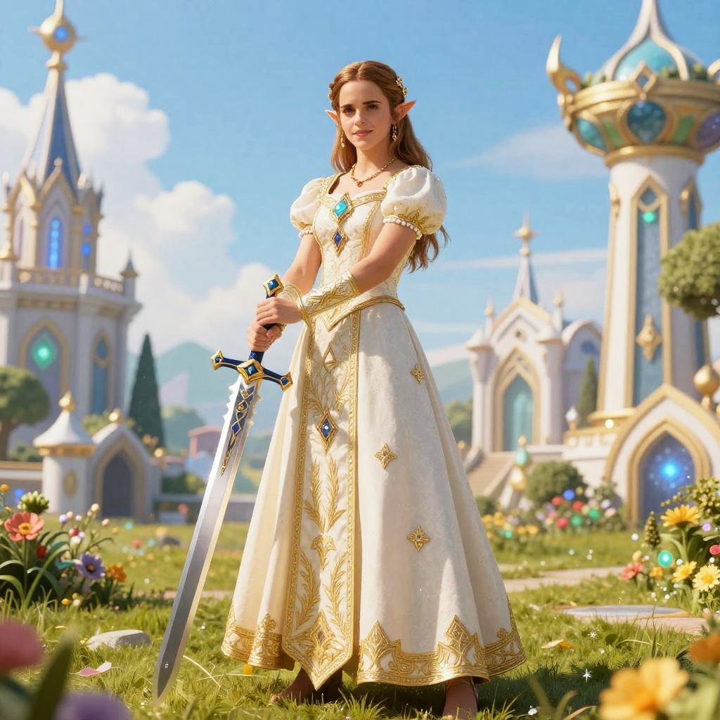 Emma Watson reimagined as a Legend of Zelda character, wearing a royal Hylian gown with elven accessories, holding the Master Sword, surrounded by a magical kingdom, vibrant colors, fantasy art