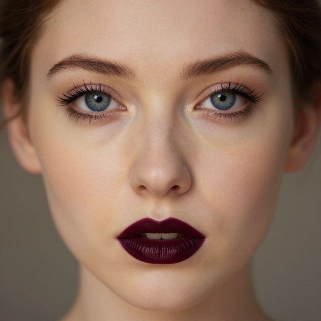 Photograph of a pale-skinned woman with striking blue eyes, dark brown eyebrows, and full lips painted in deep burgundy lipstick. Her makeup is meticulously applied, with subtle eyeliner and long, thick lashes. Her brown hair is pulled back, and the background is a simple, blurred gray, making her face the focal point. The image has a high-contrast, hyper-realistic style, emphasizing her facial features and the texture of her skin.