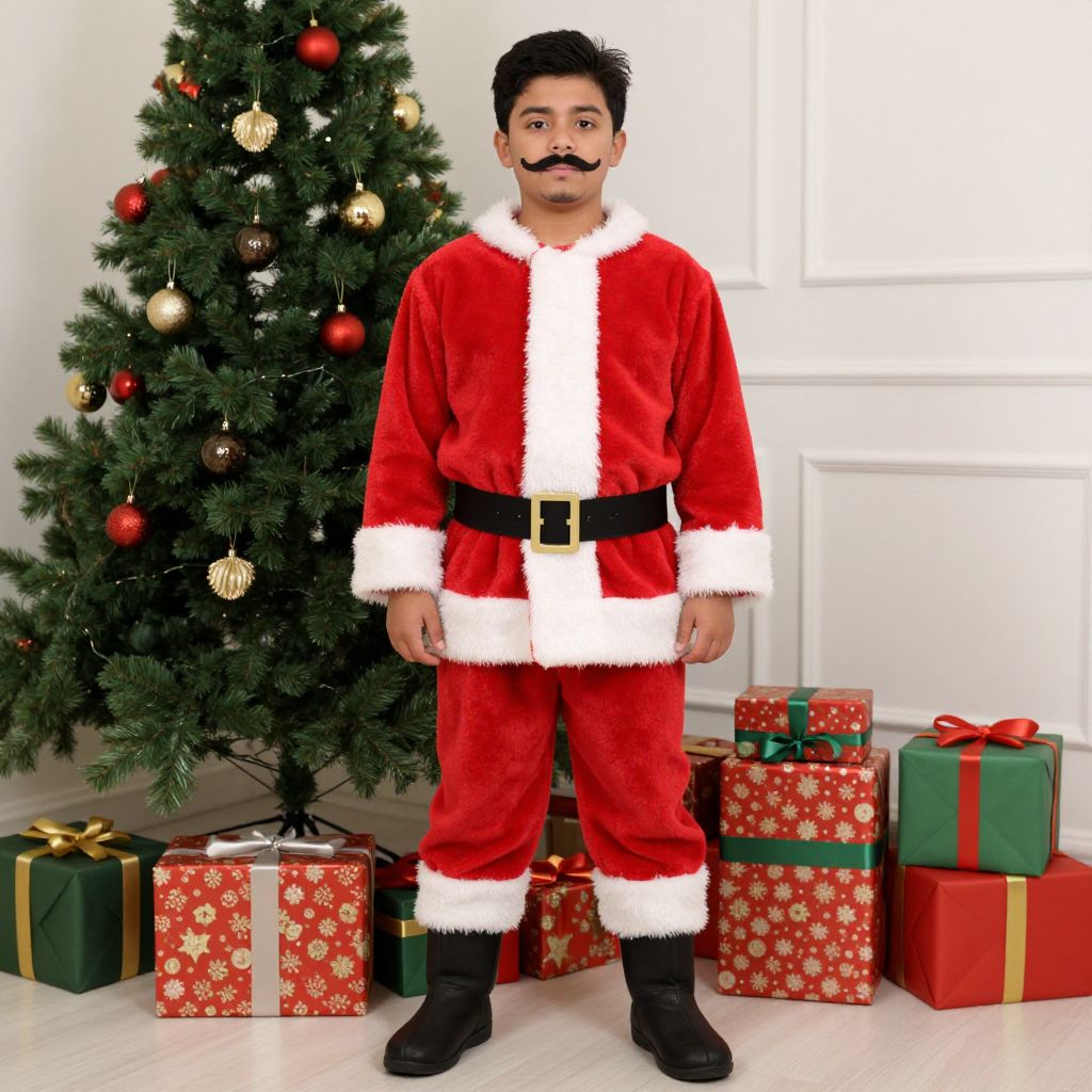 Photograph of a young boy with a mustache wearing a red Santa suit with white trim, standing in front of a decorated Christmas tree and wrapped presents