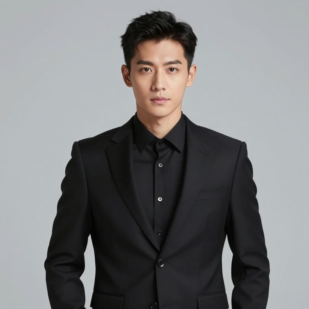 A sophisticated portrait of a stylish man wearing a black suit against a minimalist gray backdrop. His confident expression and well-groomed appearance convey elegance and modern professionalism.