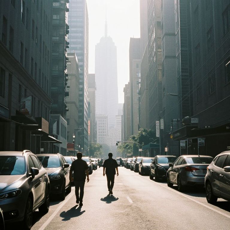 Sunlight filters through a misty urban canyon, casting elongated shadows as pedestrians navigate the bustling street lined with parked cars and towering buildings, converging towards a distant skyscraper piercing the hazy horizon.