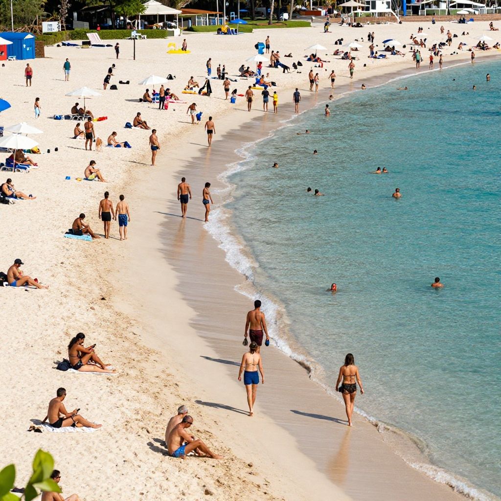 Photograph of a vibrant, sunlit beach scene. The white sand is dotted with numerous sunbathers, swimmers, and beachgoers. People of various ages and ethnicities wear swimsuits of different colors, with some in bikinis, others in trunks or one-piece suits. The clear, turquoise ocean has gentle waves lapping at the shore. In the background, there are colorful beach umbrellas, a few small buildings, and lush green trees. The image has a bright, high-contrast style, emphasizing the lively atmosphere.