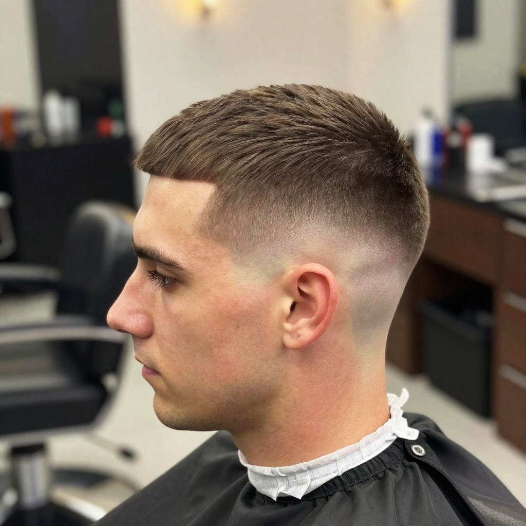 Fade haircut white male in a barber shop setting, medium skin tone, clean fade haircut with precise lines, stylish contemporary look, warm colors, professional lighting, side profile view
