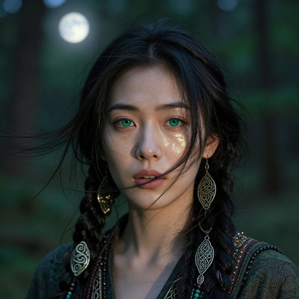 Envision a portrait photograph of an East Asian woman with deep emerald eyes and raven hair, gently blowing in the wind. Her expression shifts from serene tranquility to fierce determination as light dances across her face, highlighting intricate Celtic-inspired jewelry woven through braided locks. Framed by lush verdant forest, illuminated by a hidden full moon's soft glow, this close-up shot artfully blends traditional folklore with contemporary style, evoking an emotional gradient of mystical serenity and untamed wildness.