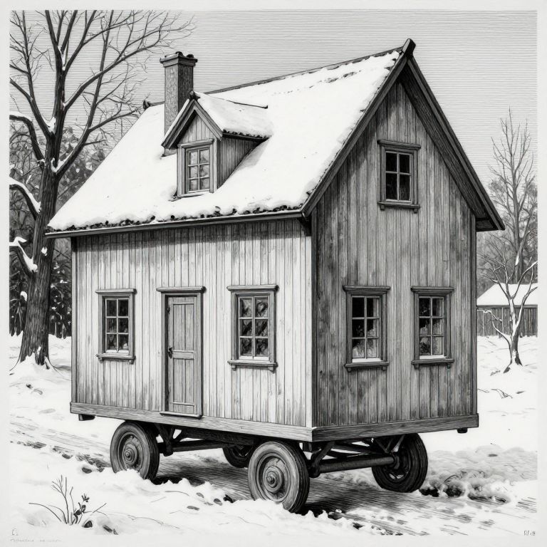Black-and-white digital drawing of a small, wooden house on wheels with a snow-covered roof, situated in a snowy, leafless forest.