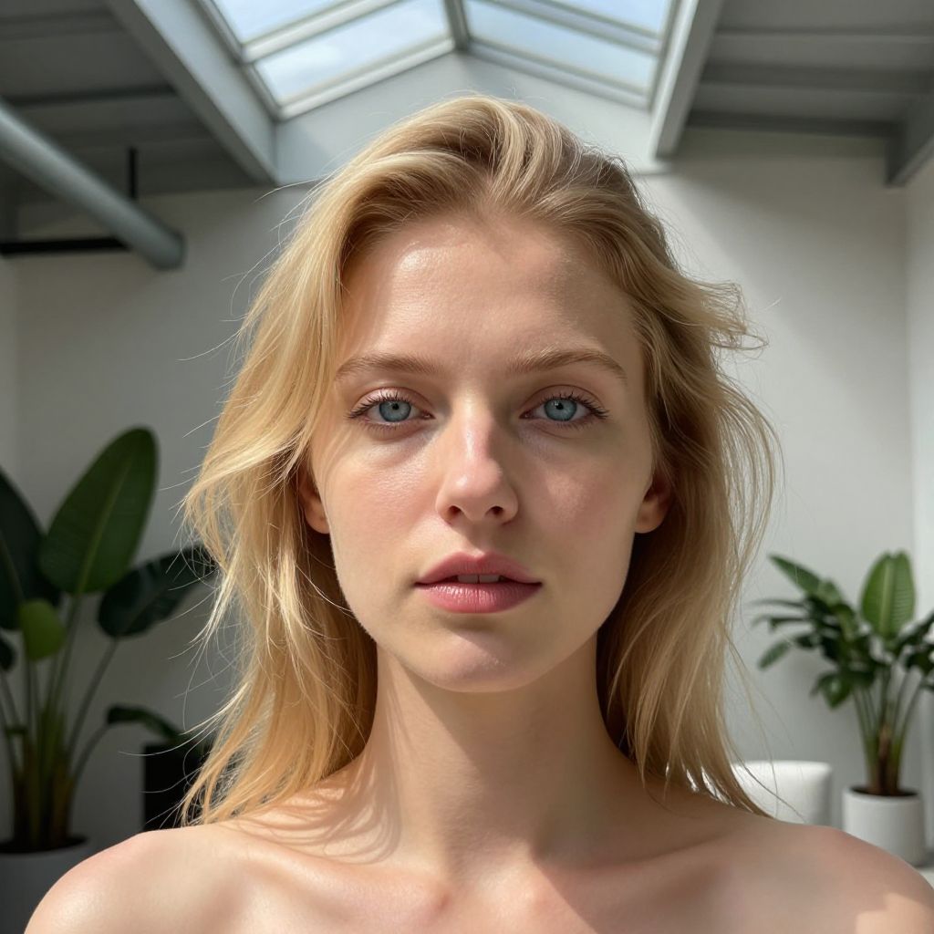 A photorealistic portrait photograph showcases a European woman with striking ice-blue eyes and flawless porcelain skin. Her flowing golden locks are illuminated by soft sunlight streaming from an overhead skylight in a modern urban loft. Captured from a unique 'worm's eye' perspective, she exudes serenity yet conveys a direct gaze as the warm light accentuates her delicate features, casting subtle shadows across her high cheekbones. The minimalist background, blending sleek industrial elements with lush indoor greenery, underscores the interplay between nature and technology, inviting viewers to contemplate the complexities of human connections in our evolving world.