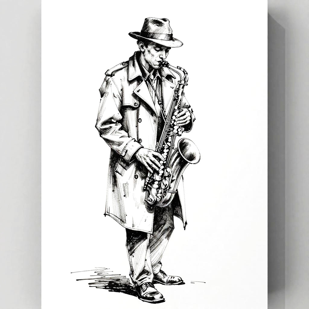 This is a ink stipple and wash study of a man with a fedora hat and trench coat holding a saxophone. One leg slightly forward, head tilted down, eyes on the strings. Quick gestural lines, confident hatching, smudged shading, casual and spontaneous. High contrast black and white on mostly white background with soft gray side borders and subtle paper texture. Clean composition, minimal props, slight figure tilt. Studio light from above, gentle falloff, elegant and restrained mood.