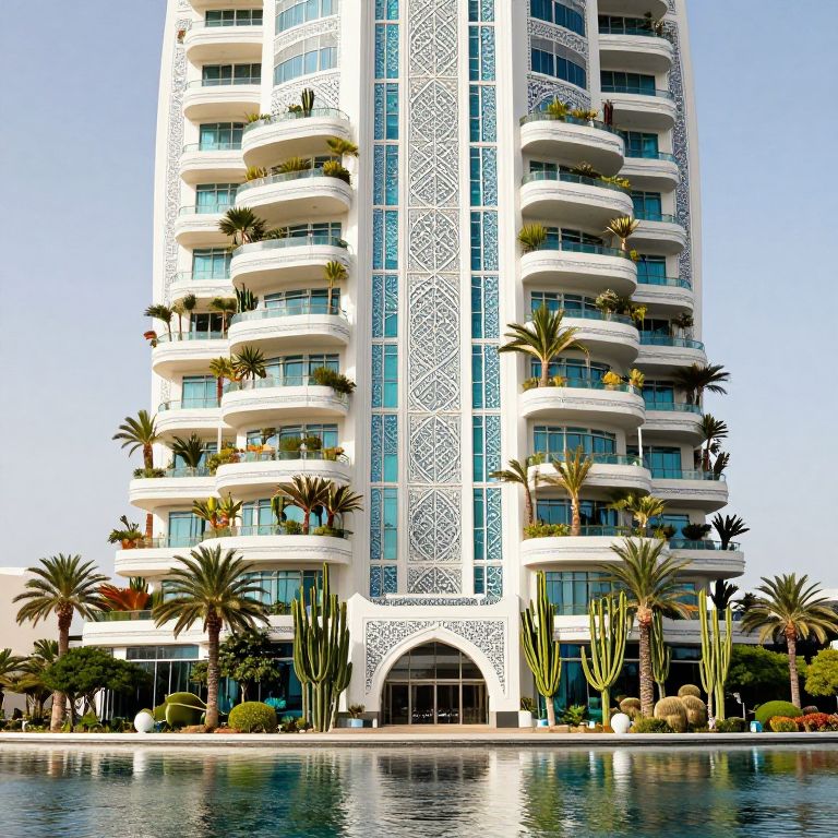 Photograph of a modern, tall, white high-rise building with intricate Arabic geometric patterns on the central vertical facade. The building features multiple curved balconies adorned with potted palm trees and other greenery. The structure has large, rectangular blue-tinted windows. In front of the building, there is a clear reflective pool with tall cactus plants and palm trees lining the edge. The sky is clear and bright blue, enhancing the building's white and blue color scheme. The overall scene exudes a luxurious and tropical resort-like atmosphere.