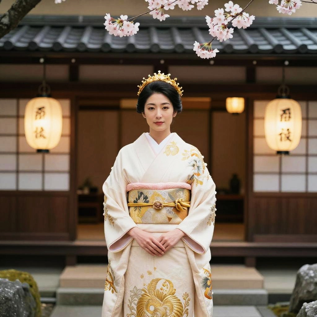 Photograph of an elegant East Asian woman standing in front of a traditional Japanese building. She wears an ornate, cream-colored kimono with gold embroidery, a golden crown, and has a serene expression. Cherry blossoms hang above her, and two glowing lanterns flank the building. The background shows a softly lit doorway and steps, creating a peaceful, traditional atmosphere.