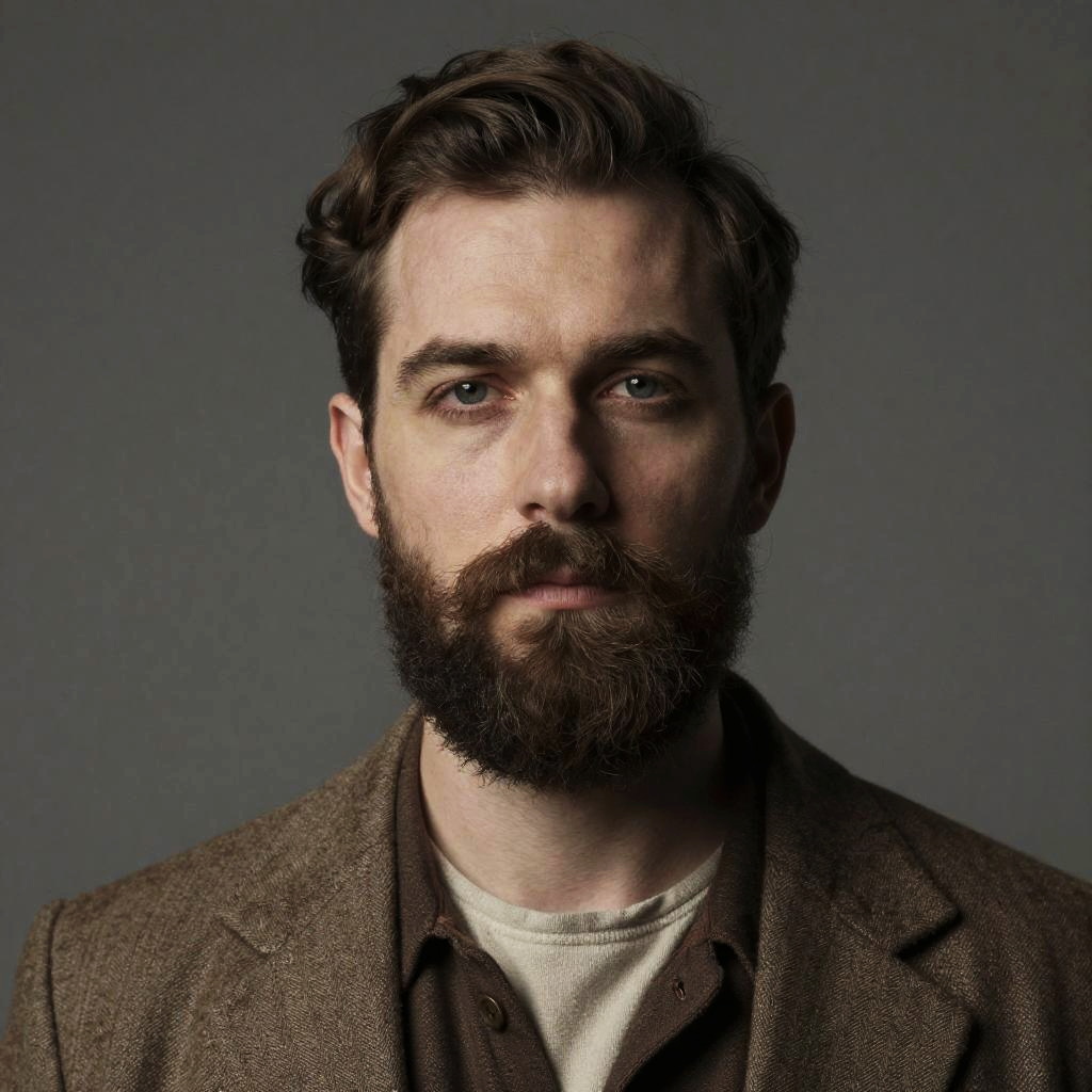 Portrait of a man with a medium beard wearing vintage clothing, soft ambient light, muted color palette, studio background, high detail on hair and skin textures