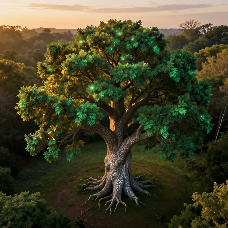 An enchanting portrait reminiscent of Renaissance masterpieces, this captivating scene features an awe-inspiring sentient tree with luminescent emerald leaves standing tall amidst a tranquil forest glade. The golden twilight light bathes the serene setting in a warm glow as the majestic tree's intricate bark patterns resemble delicate lace. From an aerial perspective, this ethereal landscape captures the breathtaking beauty of nature intertwined with mythical elements, evoking a sense of wonder and reverence for life's hidden mysteries.