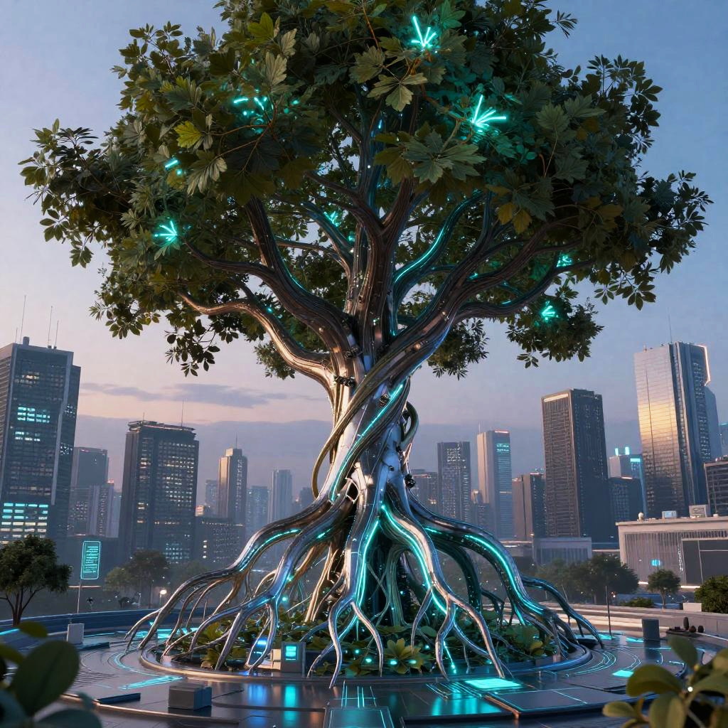 Futuristic tree with glowing neon leaves, metallic bark, set against a cyberpunk cityscape at dusk, intricate bioluminescent roots spreading over digital terrain, highly detailed