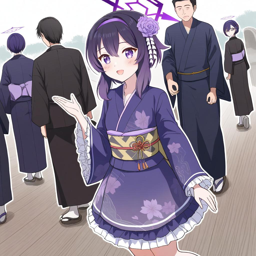 Anime-style illustration featuring a young girl with purple hair and eyes wearing a detailed purple kimono with floral patterns and frilled sleeves. She has a purple flower hair accessory and a matching hairband. The girl is standing and gesturing forward with a friendly expression. In the background, several other characters dressed in traditional Japanese kimono in dark colors are walking away or standing, creating a cultural scene. The setting seems indoors with wooden floor.