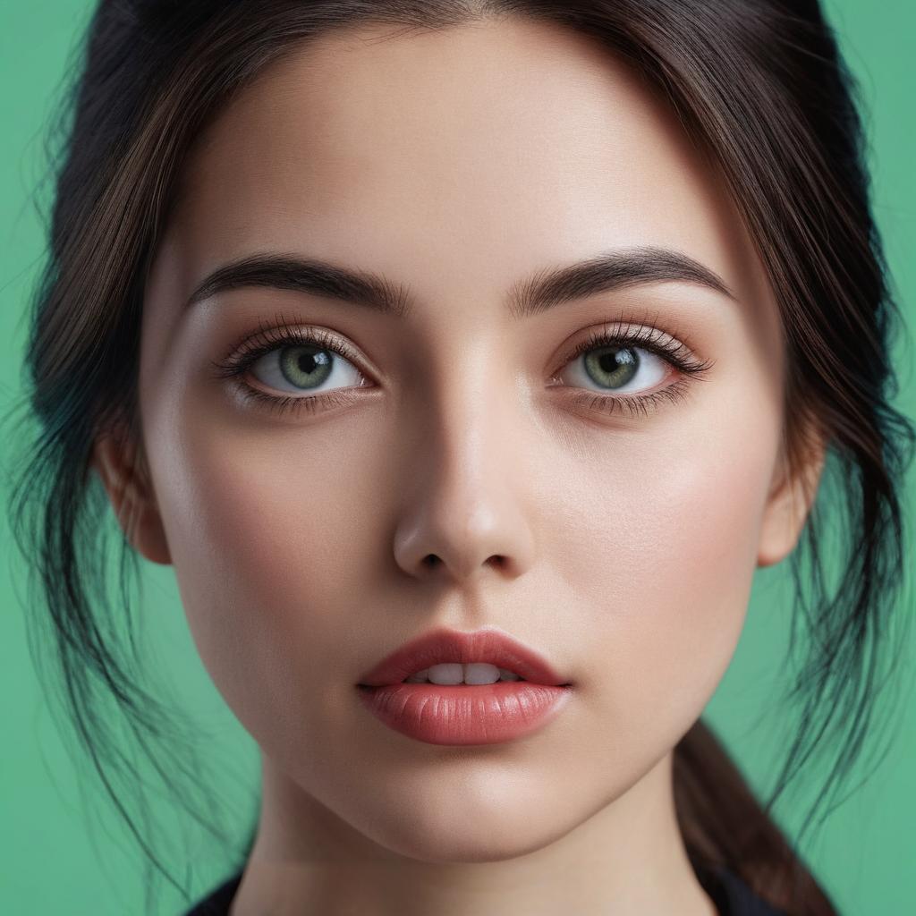 Photorealistic close-up portrait of a young woman with long brown hair tied back, green eyes, and natural makeup. She has a small mole under her mouth and is gazing directly at the camera against a simple green background. Her lips are slightly parted, and her eyebrows are well-defined.