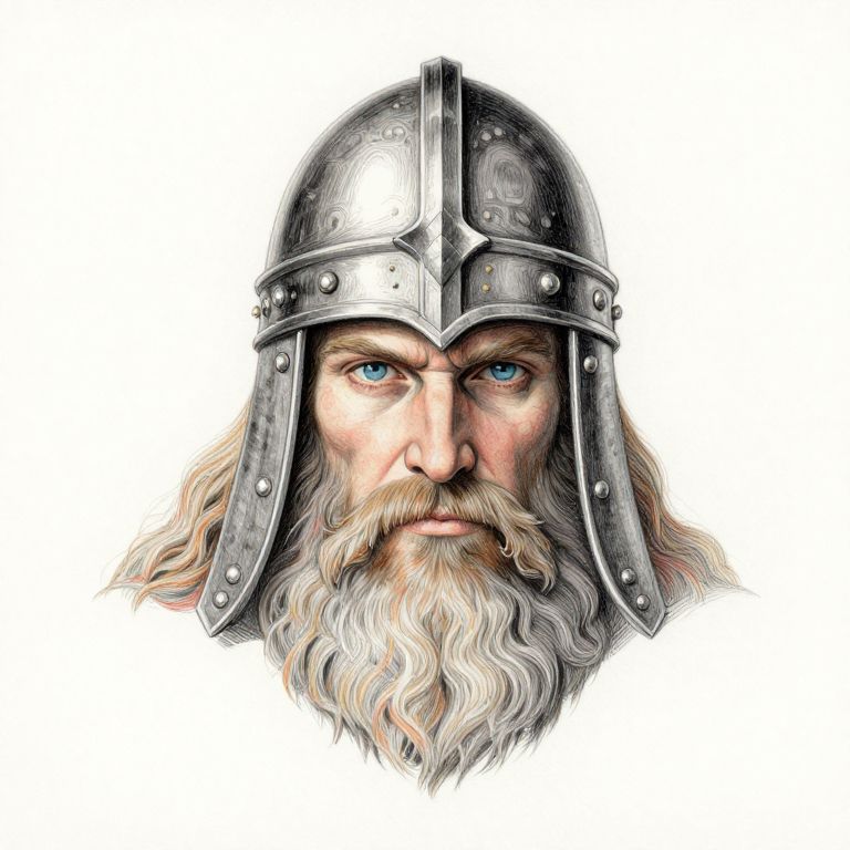 Digital drawing of a stern-faced, blue-eyed elderly Viking warrior with a long white beard, wearing a metallic, riveted helmet.