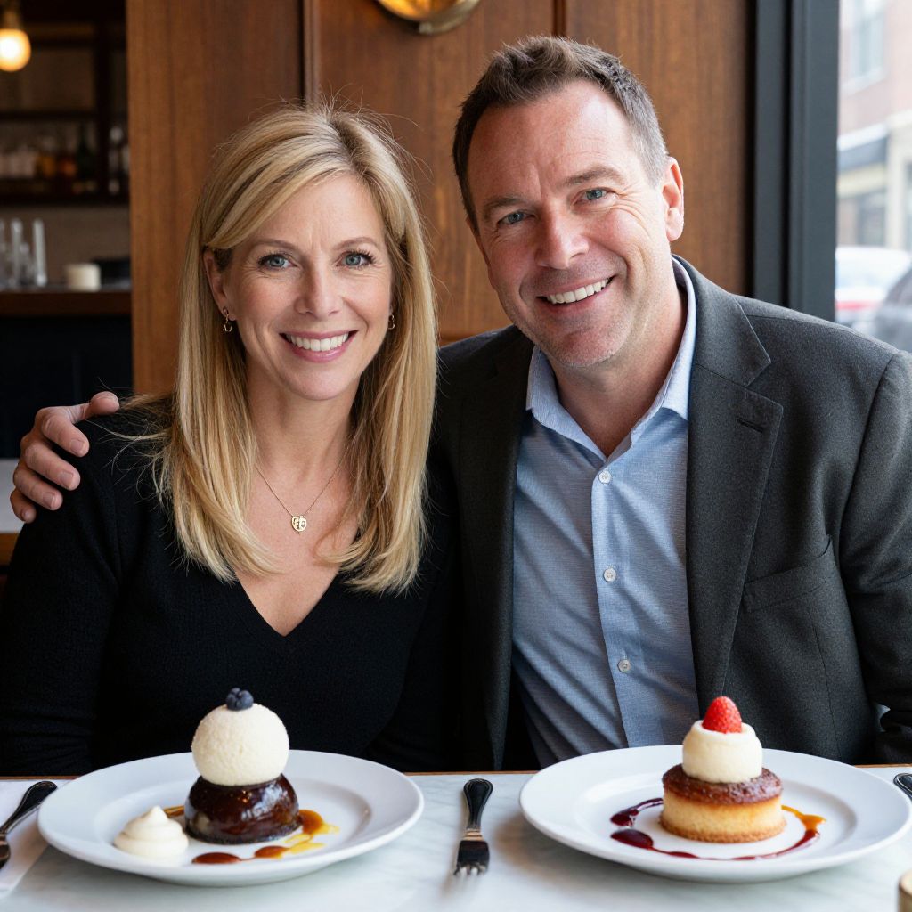 Photograph of smiling middle-aged couple, blonde woman in black top, man in gray suit and blue shirt, at restaurant with two desserts.