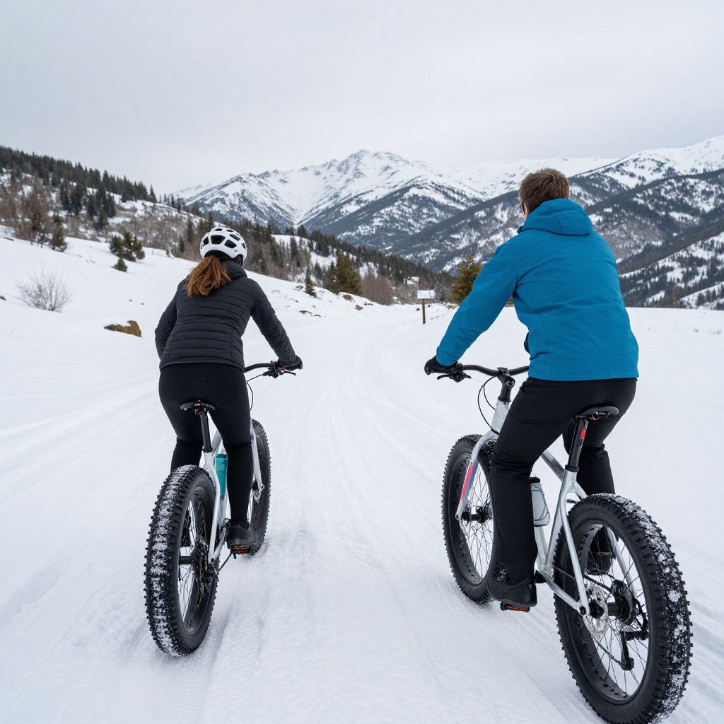 Photograph of two cyclists, one man in black jacket and pants, one woman in purple jacket, riding mountain bikes on snowy trail with snow-covered mountains