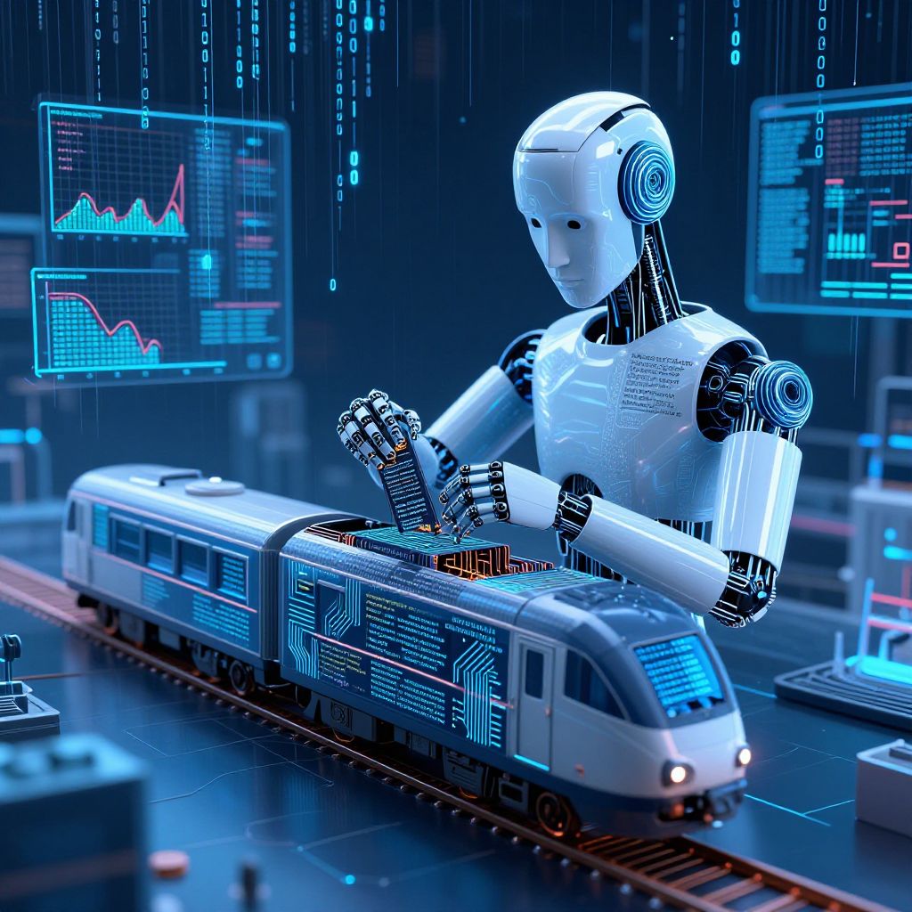 A digital CGI image depicting a futuristic, white humanoid robot with sleek, metallic joints and blue-lit circuits, controlling a high-tech, blue-lit train with intricate circuit patterns. The robot's right hand grips the train's handle, while its left hand rests on the train's roof. The background features a dark, blue-lit control room with floating holographic screens displaying colorful graphs and charts. The train, positioned on a track, has a modern, streamlined design with illuminated windows. The overall scene exudes a high-tech, sci-fi atmosphere with a focus on advanced technology and automation.