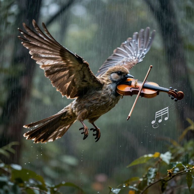 A surreal bird, cloaked in feathers of earthy tones, soars gracefully through a rain-drenched forest while defying gravity by holding and playing a miniature violin, its music seemingly woven into the very fabric of the falling droplets.