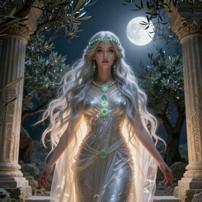 A digital art portrait of a mystical woman with long, wavy, silver hair and fair skin, wearing an ornate, metallic silver gown adorned with green gemstones. She has a green gemstone headpiece and matching necklace. Her eyes are large and expressive, and she stands under a full moon, with ancient stone pillars and olive trees in the background. Her dress has a translucent, ethereal quality, illuminated by a soft glow from below. The scene is dark yet magical, with intricate details and a fantasy-like atmosphere.