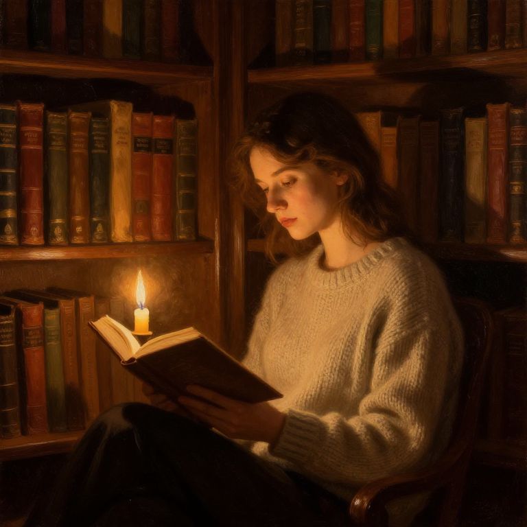 Vladislava in a cozy vintage library, surrounded by tall wooden bookshelves filled with ancient books, reading by candlelight, wearing a soft knitted sweater, warm and intimate setting, oil painting style with rich textures