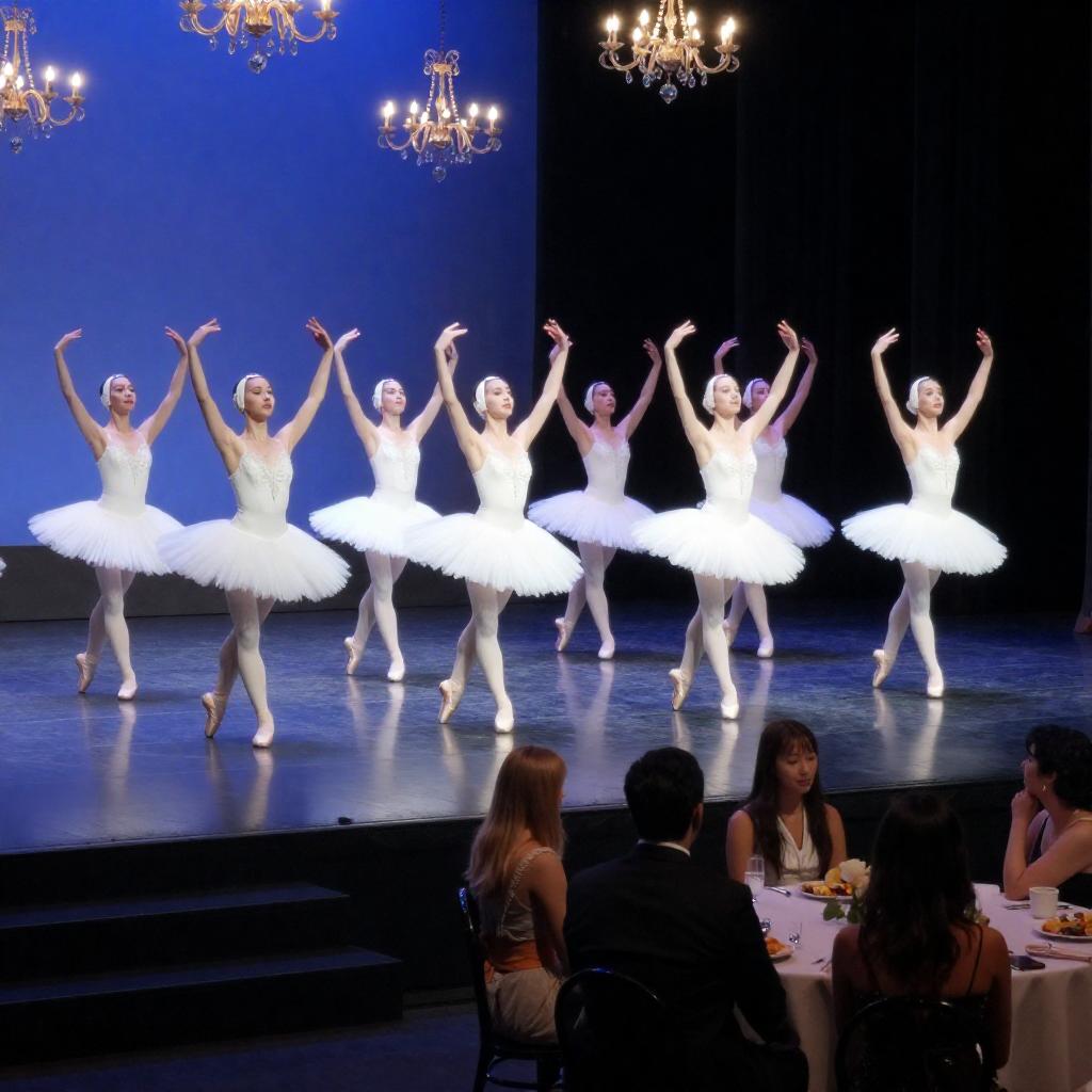 Photograph of a stage show. Dancers in white tutus and ballet shoes perform on a raised platform. Chandeliers hang from the ceiling. Audience members, including men in suits and women in dresses, sit and watch. Background has blue curtains. Dancers are in a line, some with arms raised. Front row includes a woman with blonde hair. Stage is elevated with steps. Audience is seated around round tables.