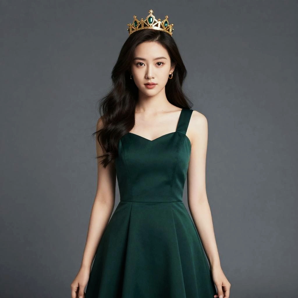 Ring Leader Costume Female, dressed in a green dress and a gold crown