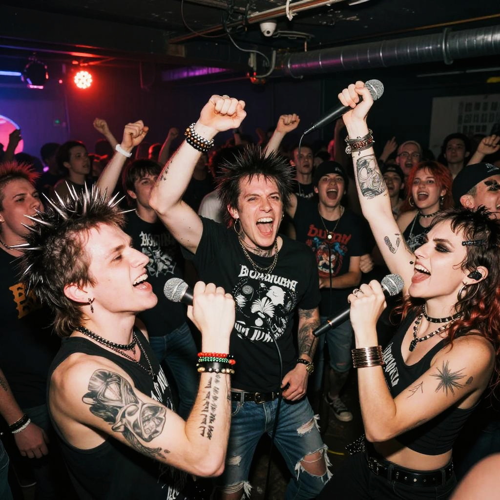 Punk themes illustrated as a chaotic music concert crowd with energetic punk rockers, spiked accessories, ripped clothing, and intense stage lighting illuminating the gritty underground venue