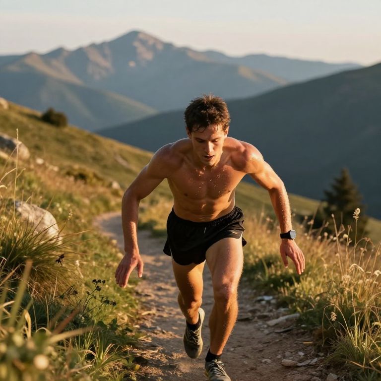 Photograph of a muscular, shirtless man with short, dark, curly hair, running on a dirt trail through a mountainous landscape. He is wearing black shorts and black running shoes with white soles, and a black wristwatch on his left wrist. Sweat glistens on his tan, defined chest and arms. The background features green, grassy hills, rocky terrain, and distant blue mountains under a partly cloudy sky. Sunlight casts warm, golden hues on the scene, highlighting the rugged texture of the trail and the man's determined expression. The image conveys a sense of motion and outdoor athleticism.