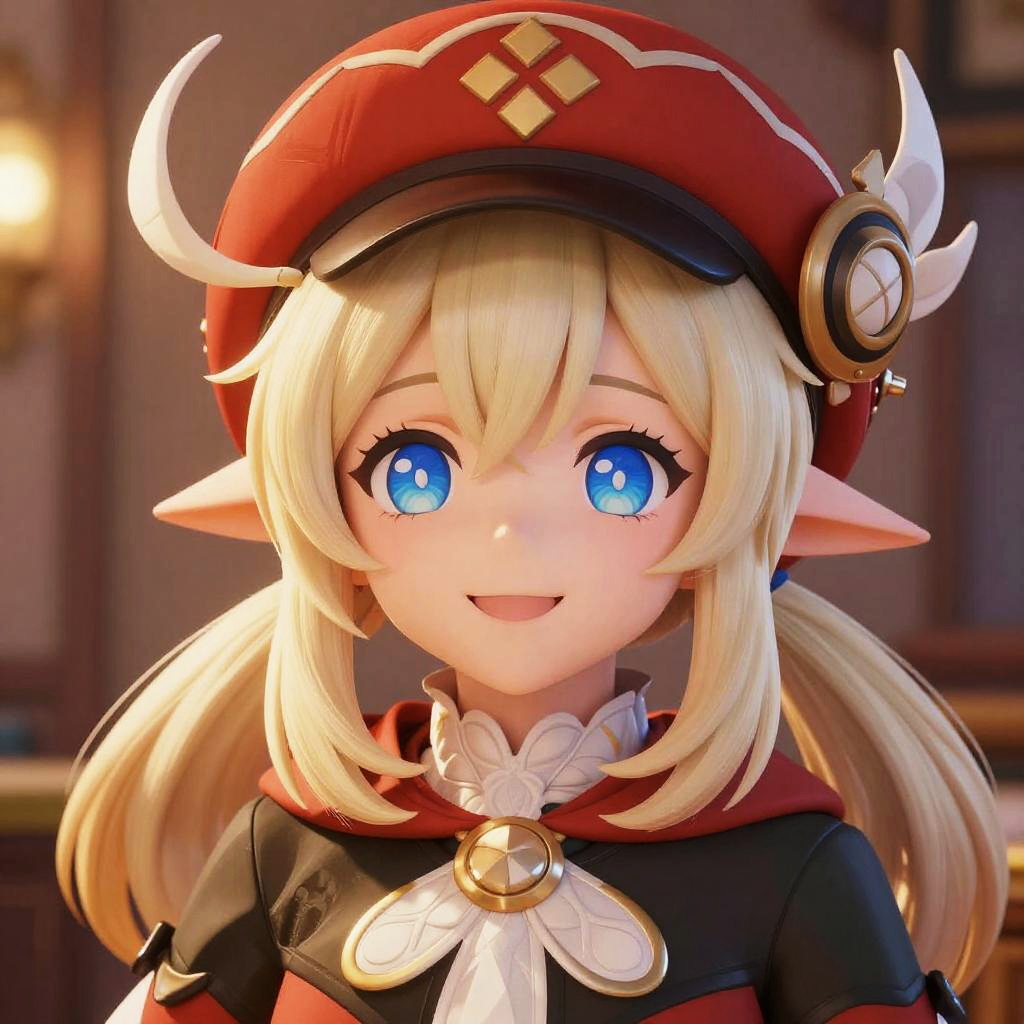 This is a digital art portrait of a cute, anime-style elf girl with large blue eyes, long blonde hair, and pointed red ears. She's wearing a Santa hat and a green, low-cut top that shows some cleavage. There's a black choker around her neck, and the background is dark with some warm, glowing light spots. Her expression is friendly and slightly playful.