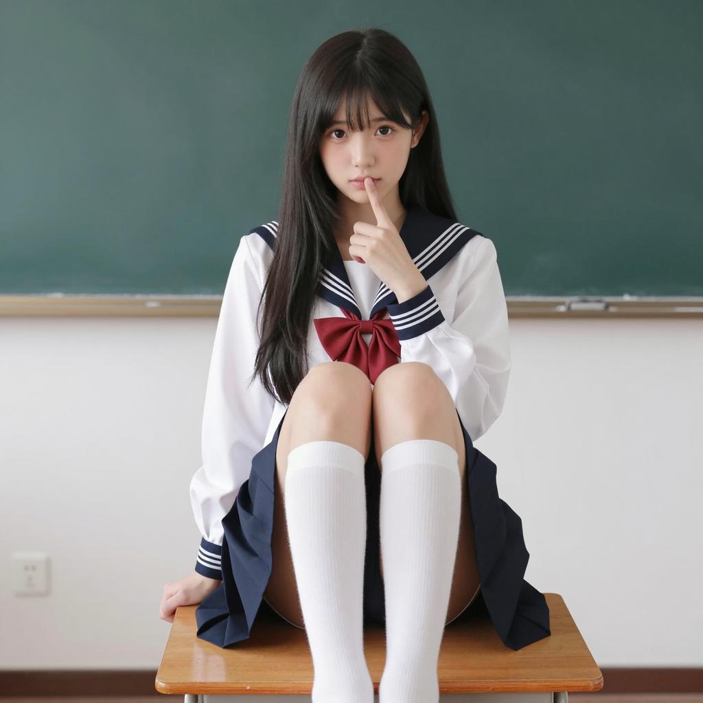 Asian woman in school uniform with navy blue sailor dress, red necktie, and pleated skirt, sitting on chair, wearing black glasses, adjusting them with right hand, long black hair, black socks, brown loafers, legs crossed, classroom with large windows, wooden floor.