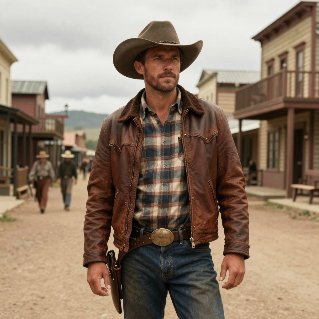 A rugged man dressed in classic western attire, including a cowboy hat, leather jacket, and plaid shirt, stands confidently in a historic Old West town street. The vintage-style photograph captures the essence of a frontier lifestyle with rustic buildings and a cloudy sky in the background.