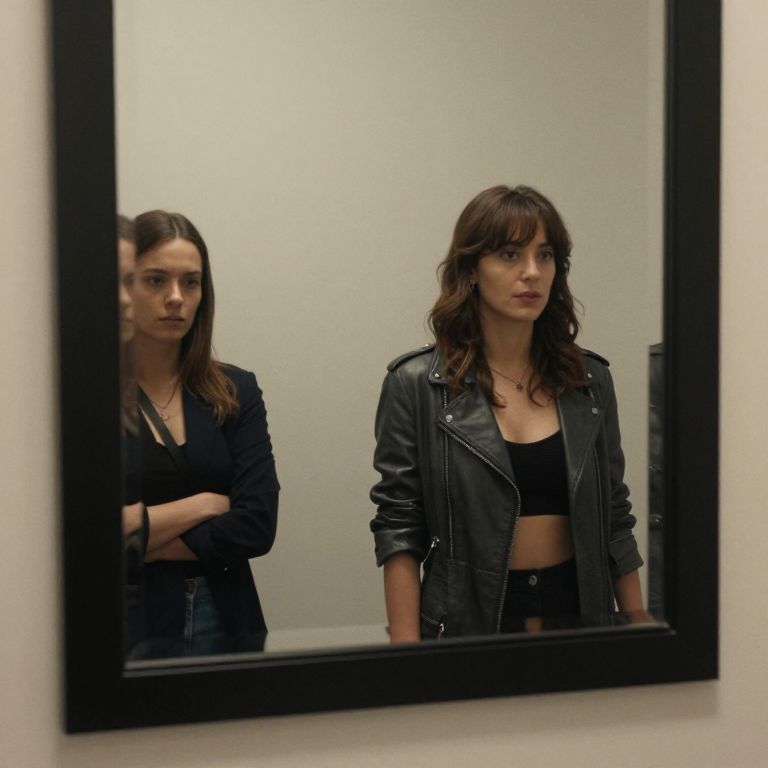 Photograph of two women reflected in a mirror. The woman on the right has wavy brown hair, wears a black leather jacket over a black crop top, and has a neutral expression. The woman on the left, partially obscured, has straight brown hair, wears a black top, and looks towards the camera with a serious expression. The background is a plain, light-colored wall. The mirror has a black frame, and the image has a slightly blurred effect, giving a slightly disconcerting feel. Both women have light skin tones.