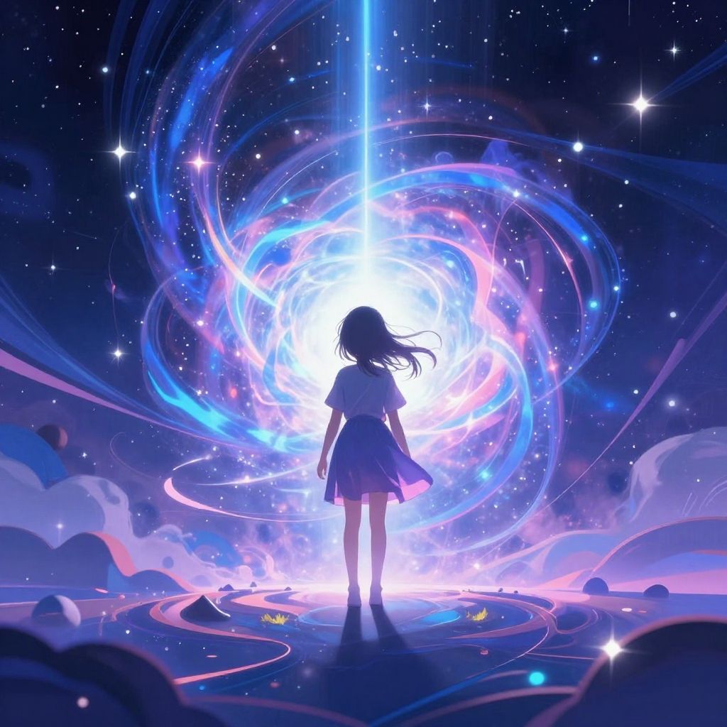 Digital artwork depicting a girl standing on an abstract, illuminated terrain under a vivid, radiant cosmic light source in a futuristic, surreal night sky environment. The scene features glowing ribbons and star-like sparkles with a color palette of blues, purples, and pinks, highlighting the girl's silhouette and her flowing hair and clothing.
