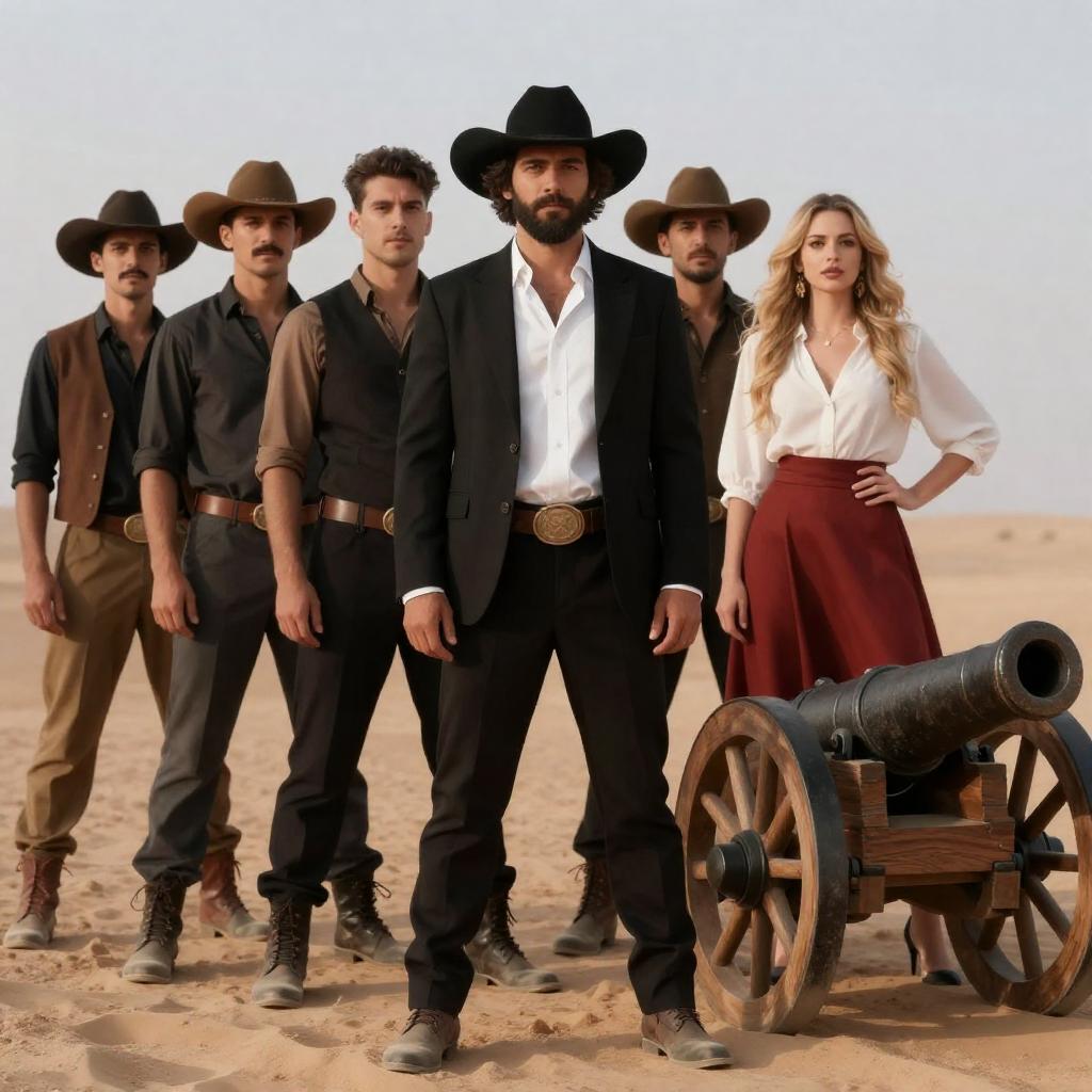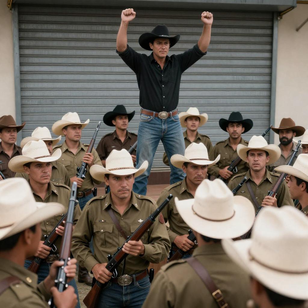 Movie poster. Colorful illustration of men on horses in the background, foreground has three men sitting with a woman. Black-and-white photograph in the upper right shows two men working at a desk. Bold red "Pueblo Fantasía" across bottom. Three men and one woman visible, intense expressions. Bright colors and dynamic composition.