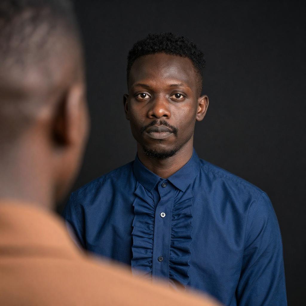 Photorealistic, sharp focus, raw photo, amateur vibe, 24-year-old Nigerian Black man, short afro, light stubble, casual musician vibe, wearing worn vintage brown leather jacket over a faded band graphic tee, selfie at dim, neon-tinged underground music venue bathroom mirror with graffiti tiles, dynamic pose, looking at viewer, face-centric composition, detailed skin pores and face texture, subtle goosebumps, natural freckles or stubble, handheld framing, taken with mobile camera, slight lens distortion, shallow depth of field, soft film grain, ambient glow, authentic imperfections, gentle vignetting, real background elements, candid atmosphere, realistic color grading, catchlights in eyes