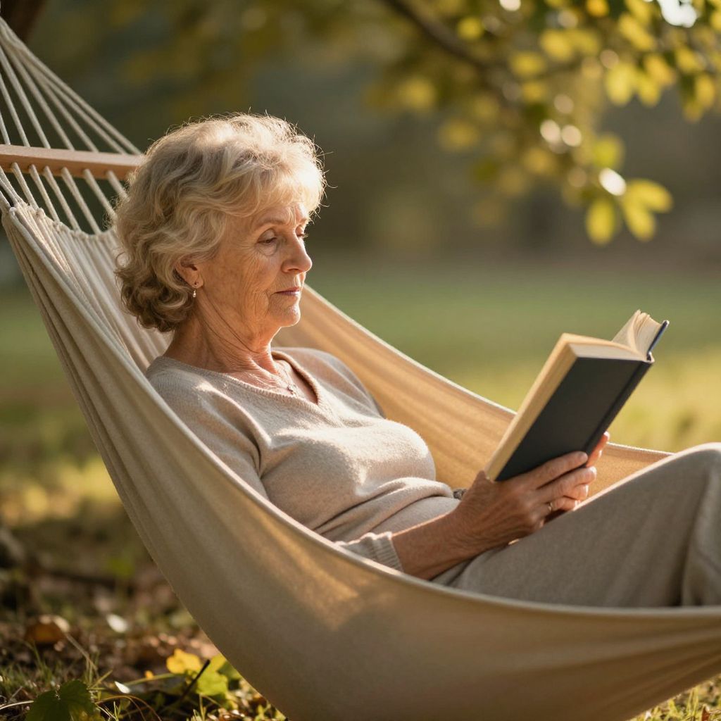 Enveloped in the gentle cradle of a hammock, a senior woman finds solace in the pages of a book, her spirit bathed in the golden light of tranquility, where the rustle of leaves and the warmth of the sun weave a tapestry of timeless peace and introspection.