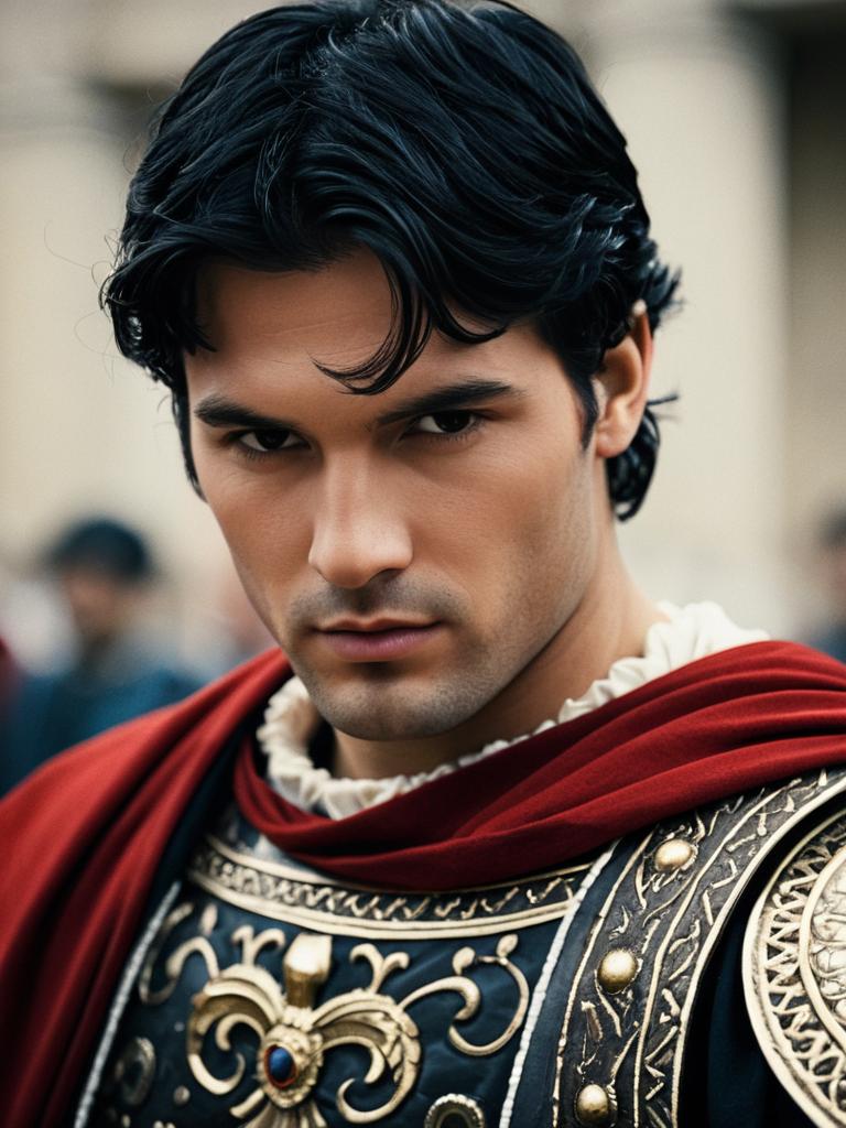 Roman costume adult, solo, realistic, 1boy, male focus, looking at viewer, black hair, upper body, blurry, blurry background