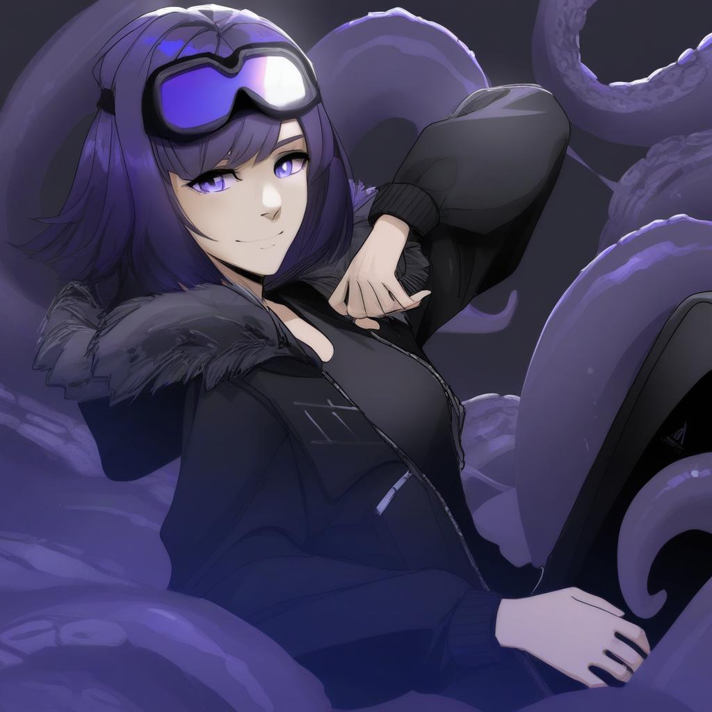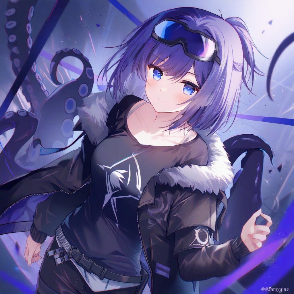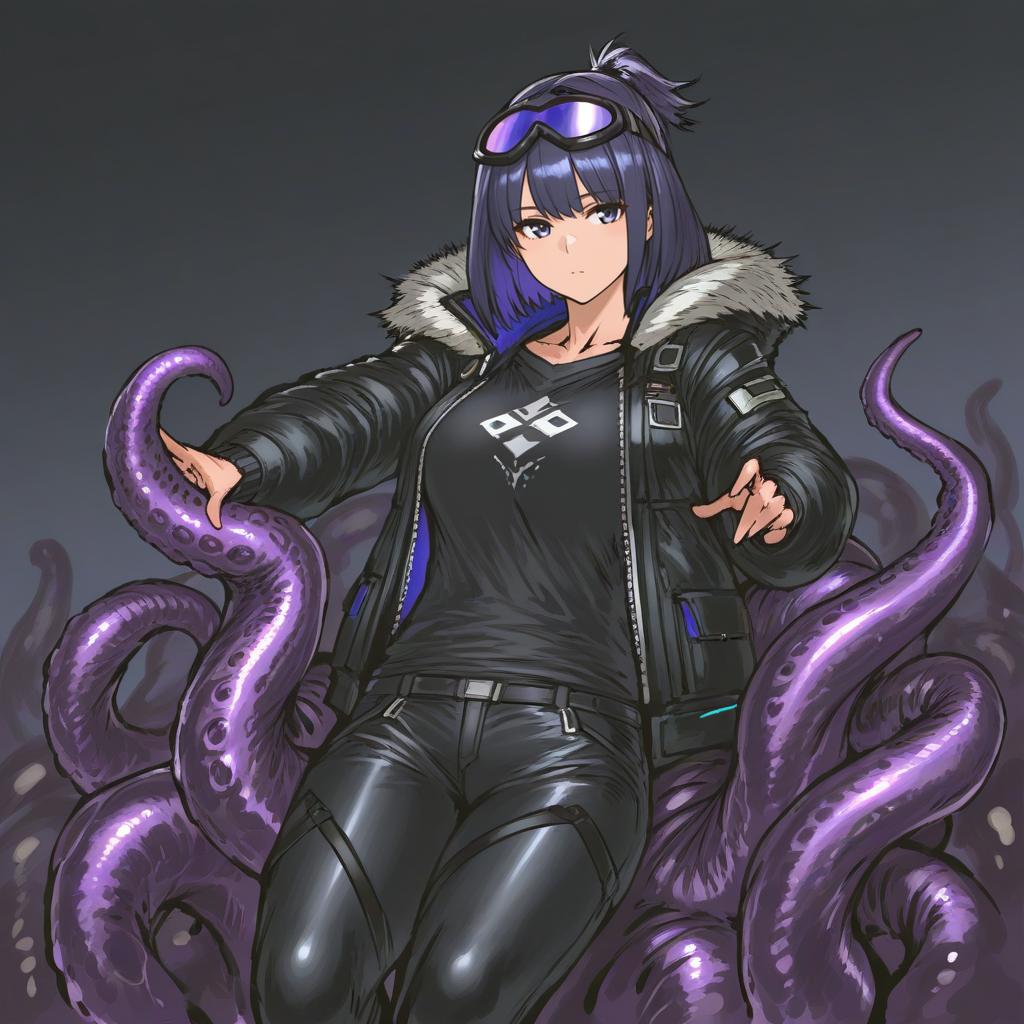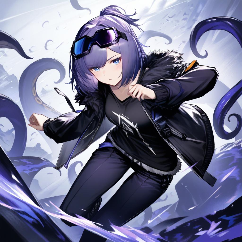 Andreana (arknights), arknights, 1girl, blue eyes, goggles on head, short hair, purple hair, black shirt, black jacket, open jacket, fur-trimmed jacket, black pants, long sleeves, tentacles, by artist nyaru (nyaru 4126), leet