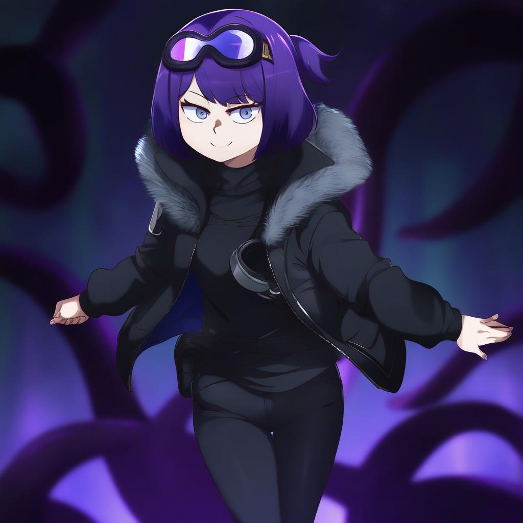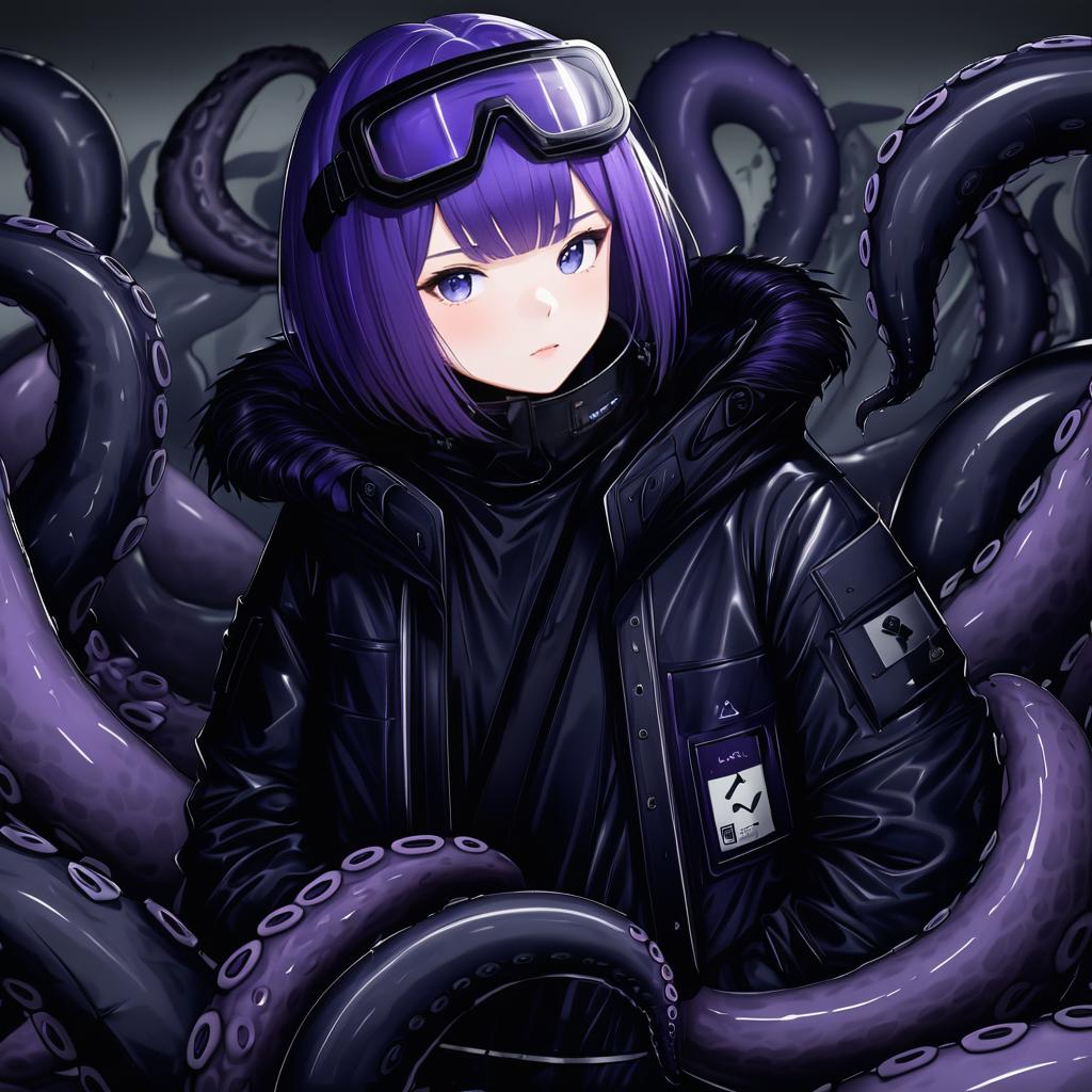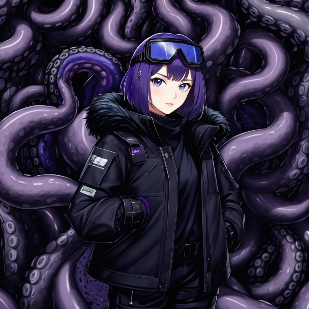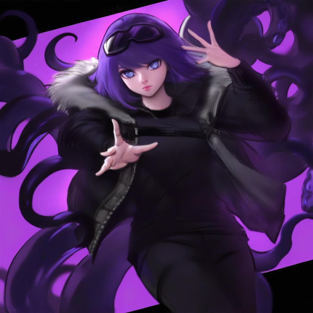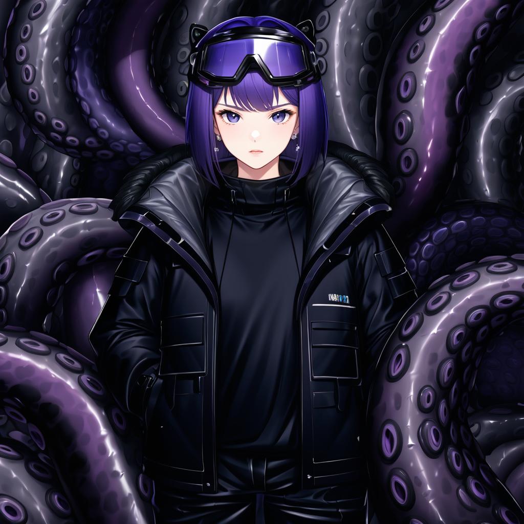 Andreana (arknights), arknights, 1girl, blue eyes, goggles on head, short hair, purple hair, black shirt, black jacket, open jacket, fur-trimmed jacket, black pants, long sleeves, tentacles, by artist nyaru (nyaru 4126), leet