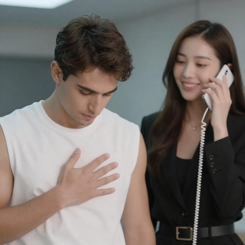 Photograph of a man with short brown hair in a white sleeveless shirt, looking down with a hand on his chest, and a woman with long brown hair in a black outfit, smiling while holding a white corded phone to her ear. They are indoors with a blue-tinted background.