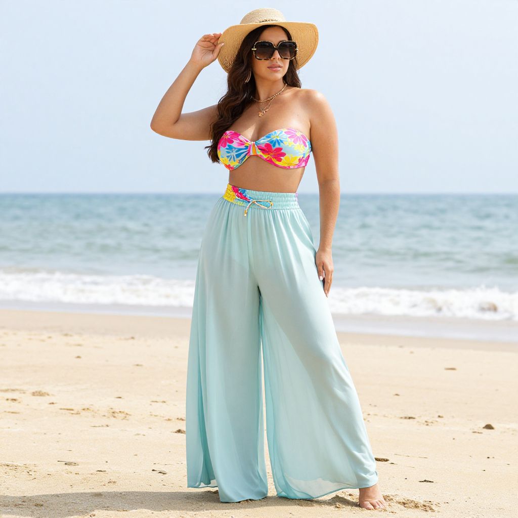 Full body shot, Curvy woman, bandeau bikini top, vibrant floral print, soft stretchy fabric, high-waisted palazzo pants, lightweight chiffon, flowing silhouette, wide leg, pastel colors, cinched waist, bohemian style, beachy vibe, accessorized with oversized sunglasses, straw sunhat, delicate gold jewelry, barefoot on sandy beach, sun-kissed skin, relaxed pose Sexy. Pretty face and beаutiful eyes. Big breasts