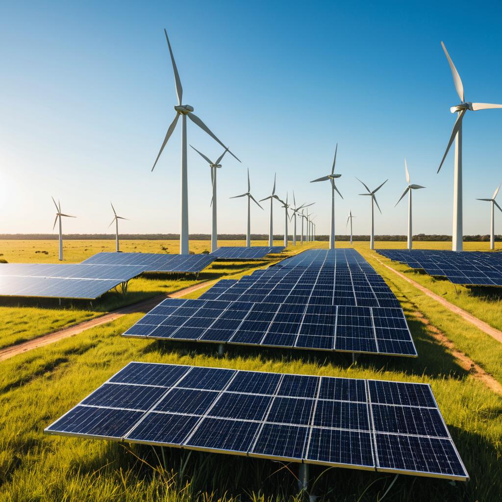 A series of sleek solar panels installed on a lush green meadow under a clear blue sky with the sun shining brightly. In the background, multiple wind turbines are visible on rolling hills, highlighting the integration of solar and wind renewable energy sources. The vibrant green grass and the sunlight emphasize a clean and sustainable energy environment.