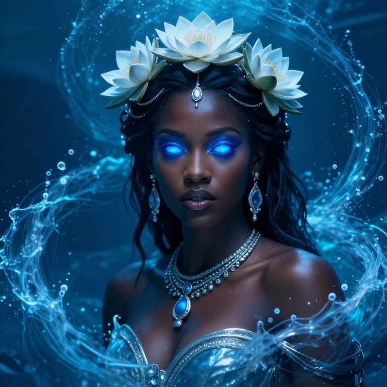 Photograph-style digital art depicts a dark-skinned woman with glowing blue eyes and black, wavy hair adorned with a white lotus flower crown. She wears a silver, off-the-shoulder top with intricate jewelry, including a pendant and earrings. Her face is illuminated by the blue glow, and she stands in a swirling, ethereal blue water effect. The background is dark, emphasizing the luminous water and her radiant eyes. The overall mood is mystical and otherworldly, with a strong focus on blue and white hues.
