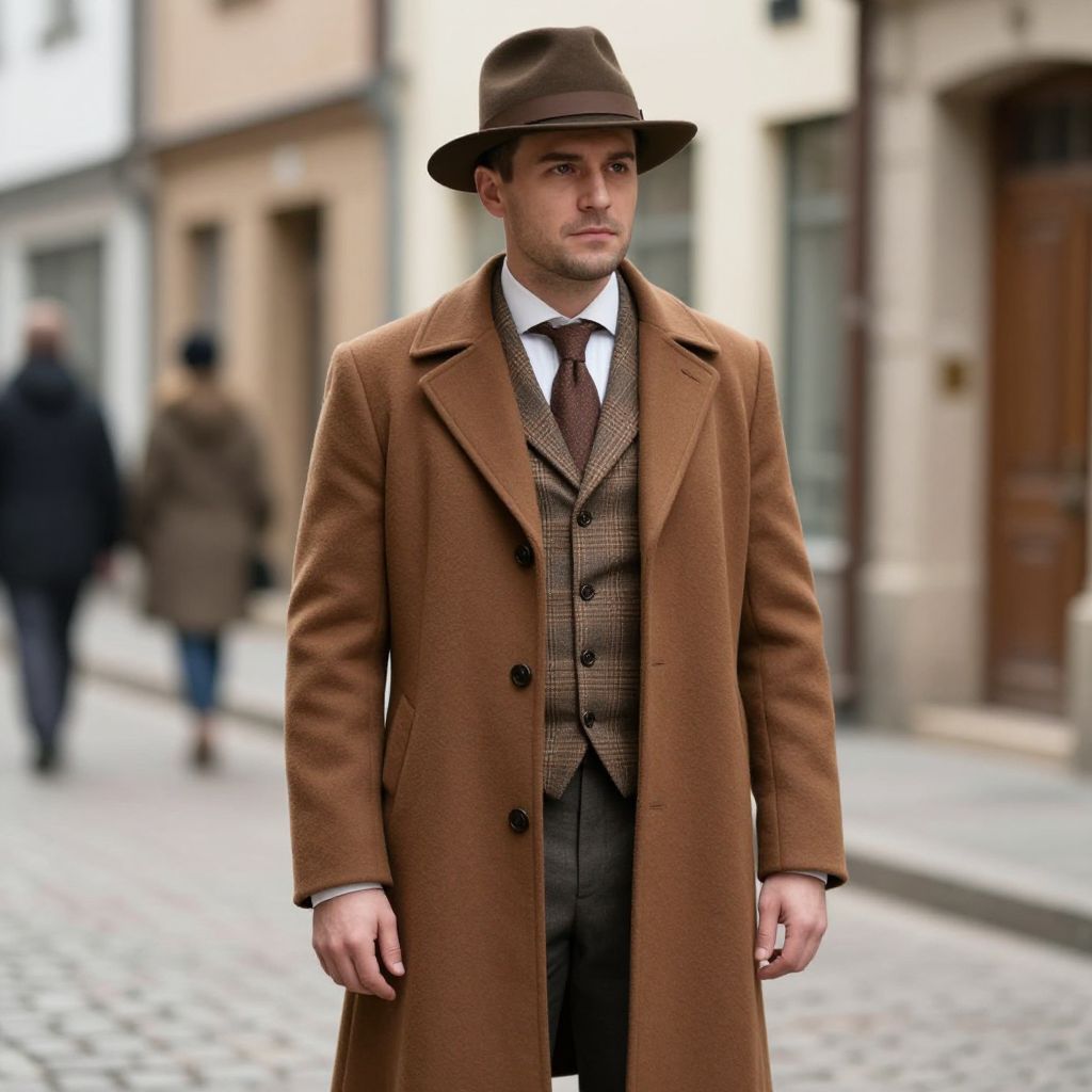 Vintage Style Man Clothing Costume, man in a brown coat and hat standing on a street