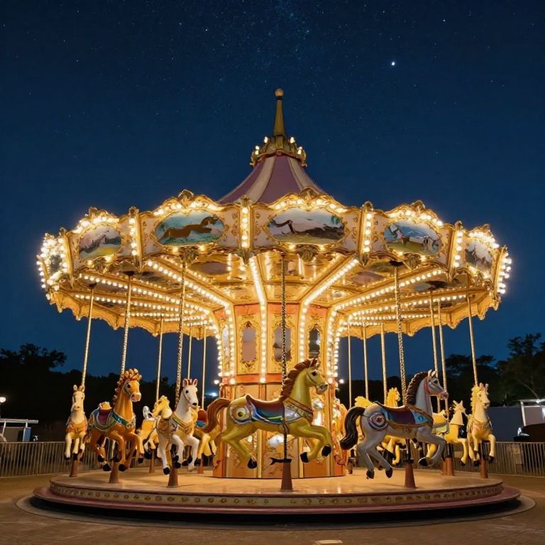 Photograph of a brightly lit, vintage carousel at night, featuring ornate, glowing horse statues with colorful, intricate decorations against a dark blue starry