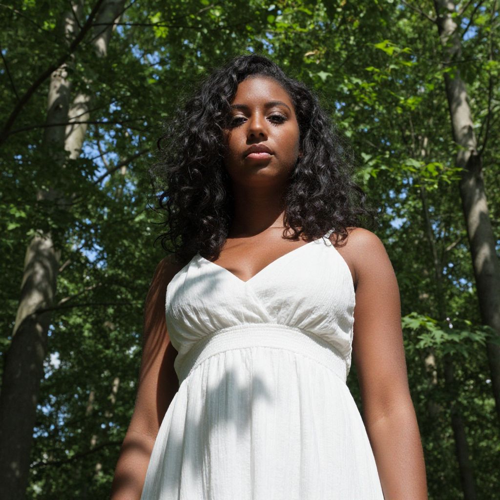 Photograph of a young Black woman with medium-dark skin and long, curly black hair, standing in a sunlit forest. She wears a sleeveless, white, V-neck dress that cinches at the waist, highlighting her average-sized breasts. Her expression is neutral, and she gazes slightly downward. The background features tall, green trees with sunlight filtering through the leaves, creating a dappled light effect. The image has a slight high-contrast, almost HDR effect, emphasizing the brightness of her dress against the dark, verdant forest.