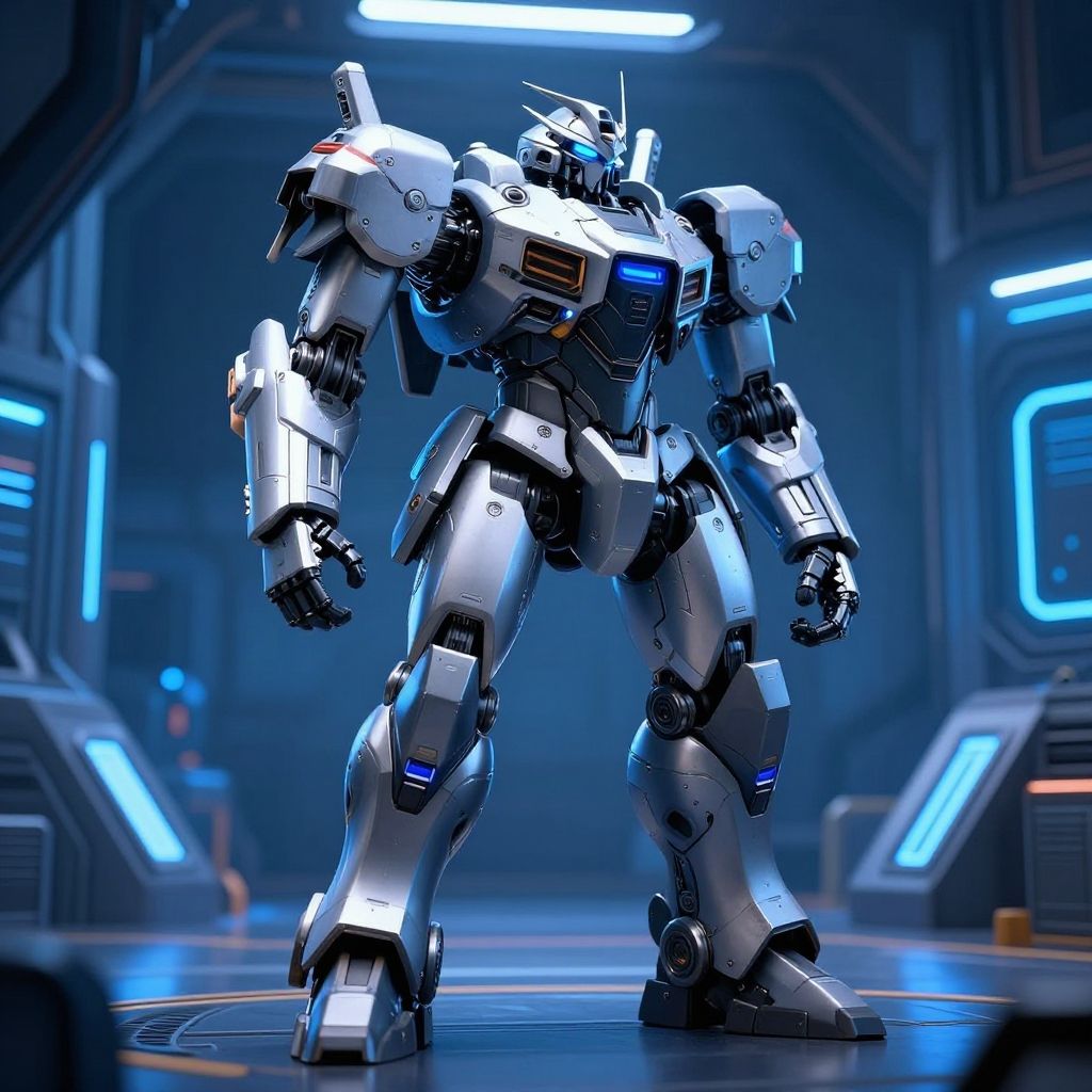 A highly detailed futuristic combat mech robot standing in a high-tech hangar or docking bay with glowing blue neon lights and advanced machinery. The mech features heavy armor plating, mechanical joints, and integrated weaponry, set against a sci-fi industrial background.